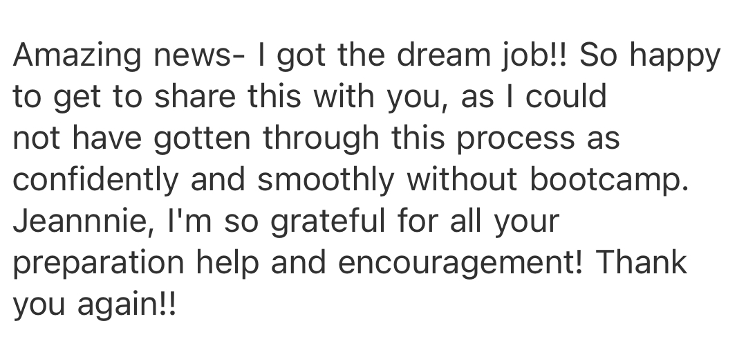 You can't afford not to invest in yourself. And because we all assume the worst case scenario (invest & still can't get a job) you can rest assured with my guarantee! If you don't land your first or second role you interview for, Jeannie will work with you until you secure your first job.